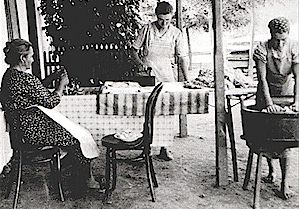 Bäuerin mit Töchtern bei der Hausarbeit