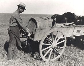 Auf der Steppe: Trogwagen mit Wasserfass