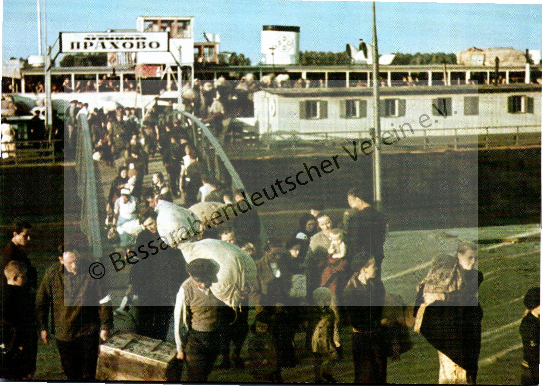 Postkarte - Ein Umsiedlerschiff trifft in Prahowo ein
