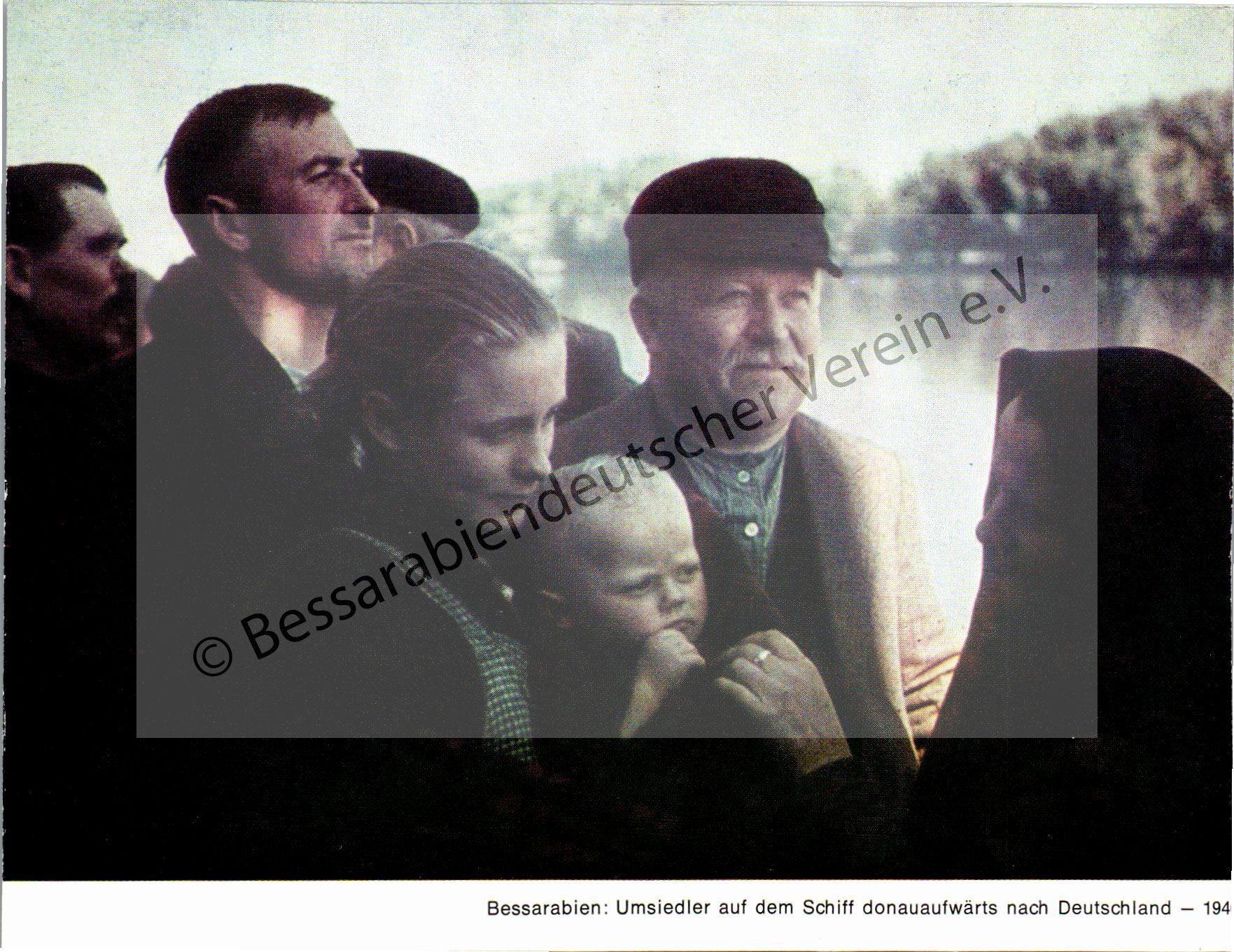 Postkarte - Umsiedler auf dem Schiff donauaufwärts nach Deutschland 1940