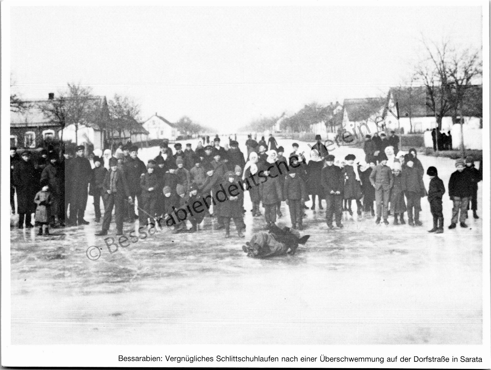 Postkarte - Vergnügliches Schlittschuhlaufen nach einer Überschwemmung auf der Dorfstraße in Sarata