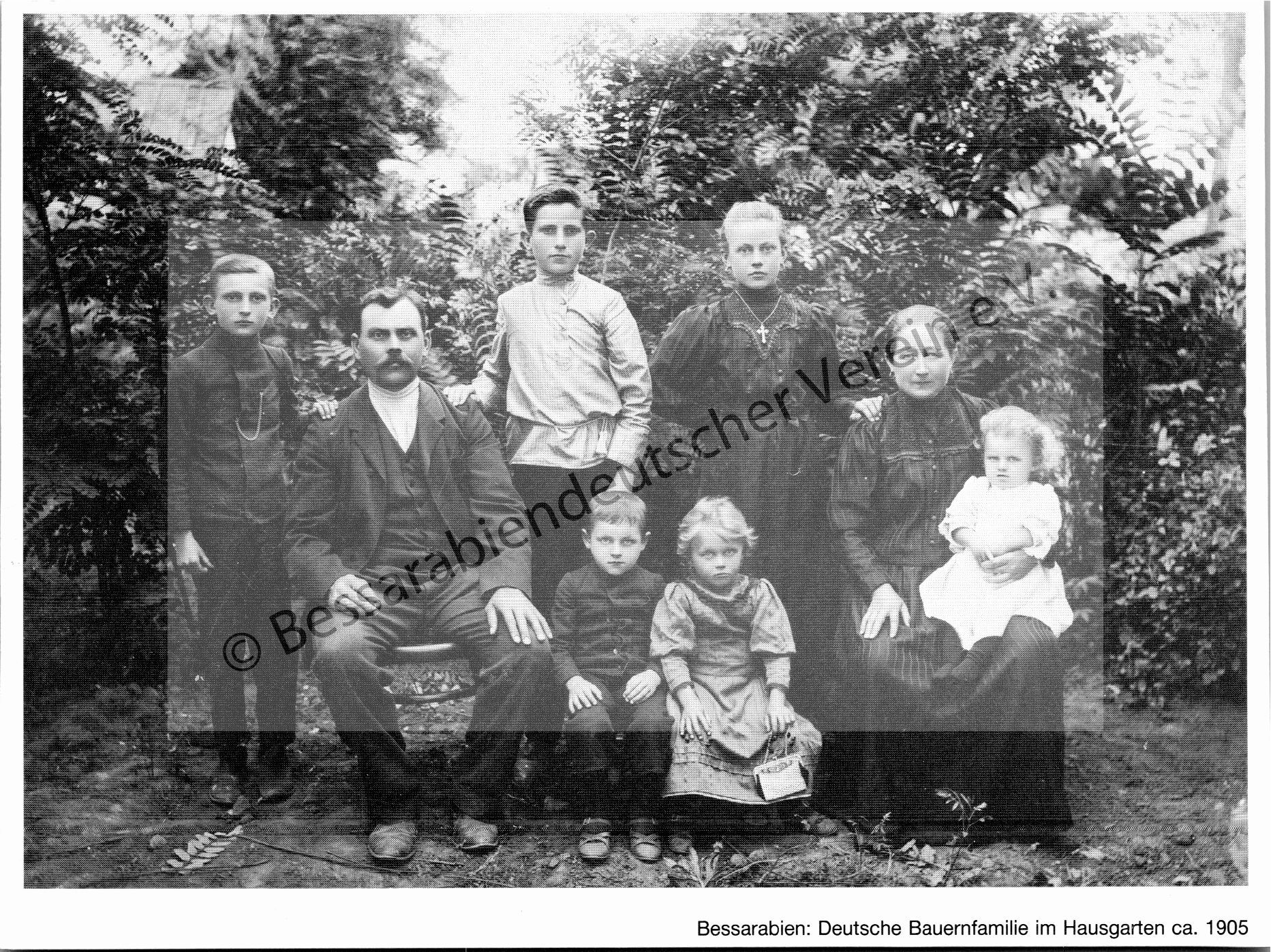 Postkarte - Deutsche Bauernfamilie im Hausgarten ca. 1905