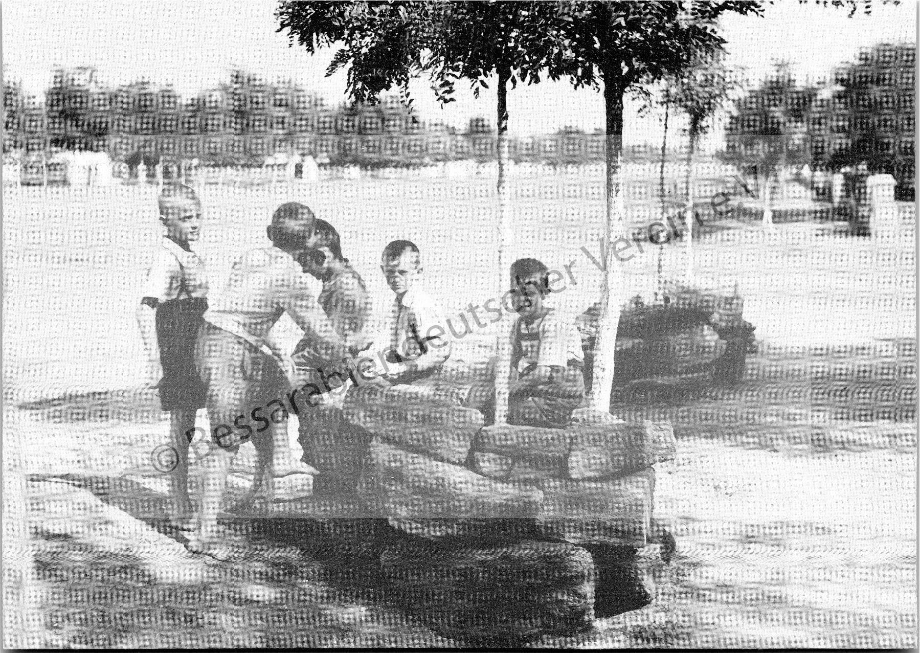 Postkarte - Friedensfeld, Buben auf der Dorfstraße