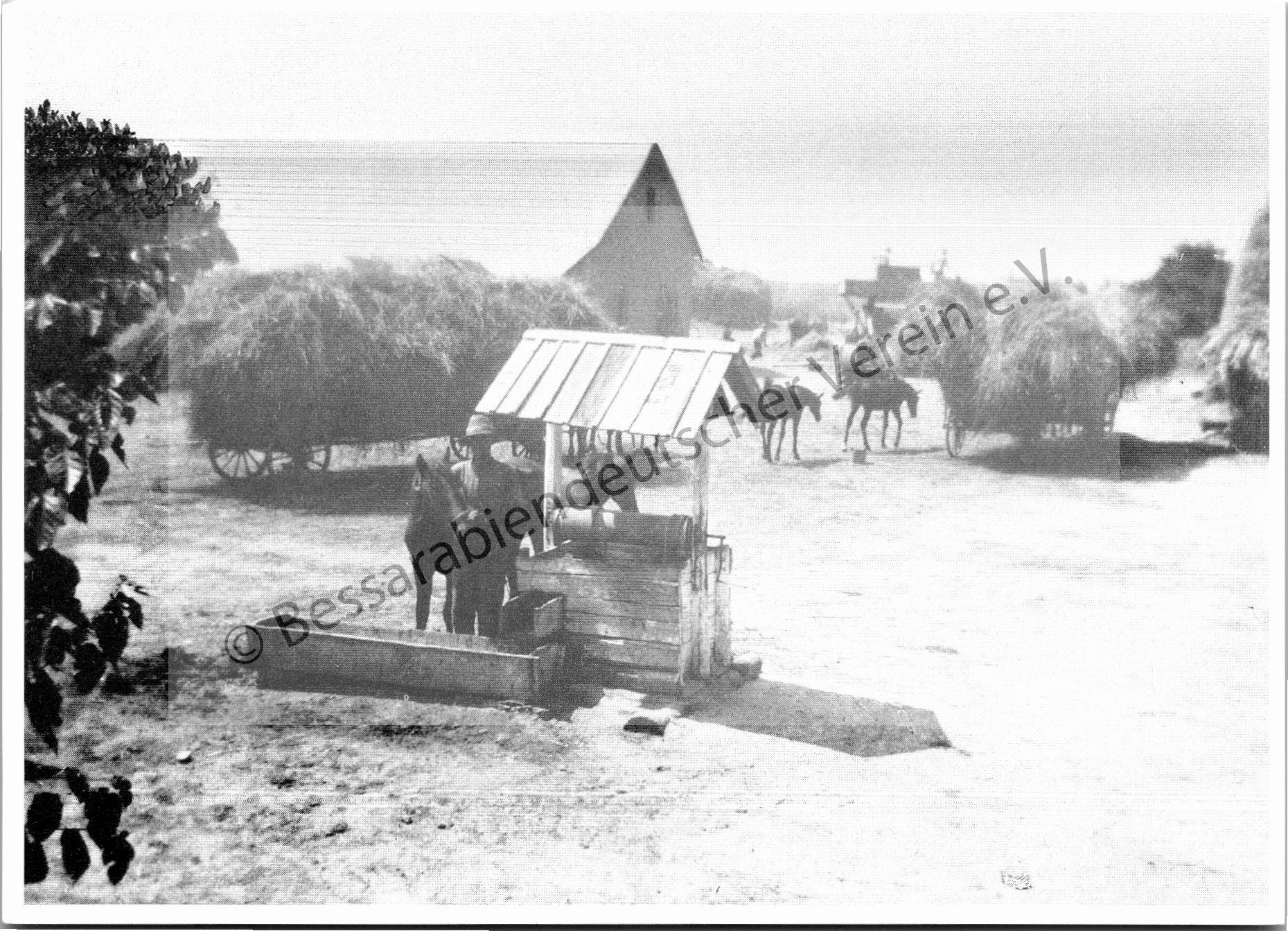 Postkarte - Beim Dreschen, vorne Pferde am Schöpfbrunnen