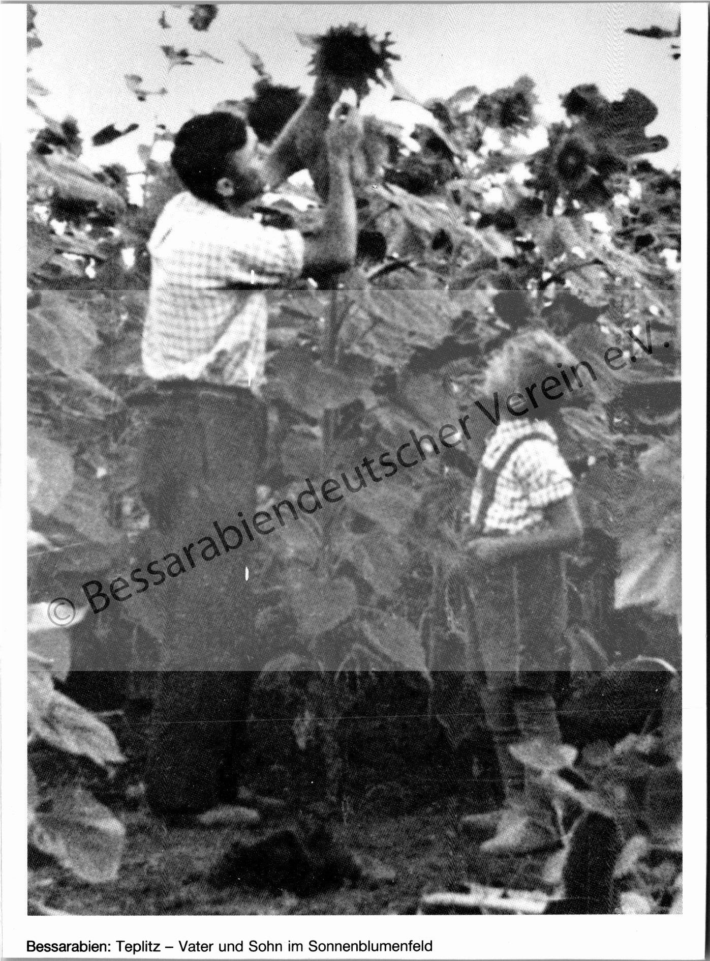 Postkarte - Teplitz, Vater und Sohn im Sonnenblumenfeld